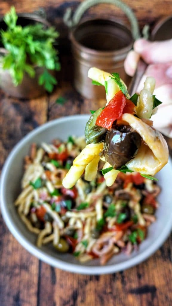 Meanwhile, cook the pasta al dente (I opted for trofie, but you can choose another type). Then, drain it directly into the pan with the sauce, adding a couple of ladles of cooking water.
