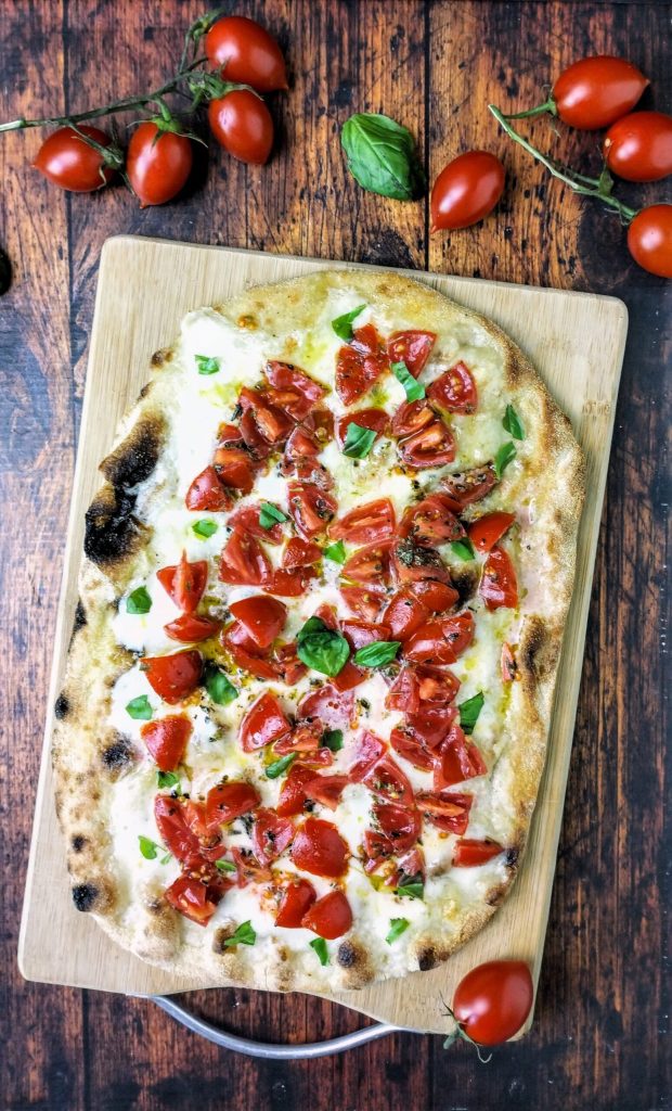 • Now, top the pinsa with the cherry tomatoes and add a drizzle of oil. Finish with fresh basil leaves.