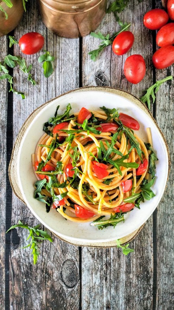 Spaghetti with cherry tomatoes and arugula are best eaten freshly made, with arugula still fresh and cherry tomatoes soft but not mushy. However, if there’s any leftover, you can store it in the fridge for up to 1 day, in an airtight container.