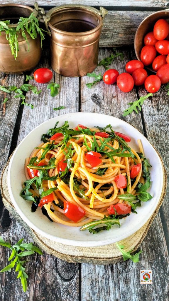 Meanwhile, cook the spaghetti and drain them well. Add them to the pan with the cherry tomatoes; and cook for 2-3 minutes over high heat.Then, add the arugula, previously well washed and dried. Serve immediately