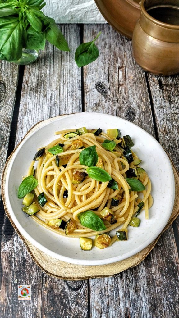In the pan, the zucchinis slowly turn golden until they reach that golden color that tastes good. Then comes the aroma of garlic, the fresh basil torn by hand, and finally the pasta, drained al dente and tossed with everything else to blend the flavors.