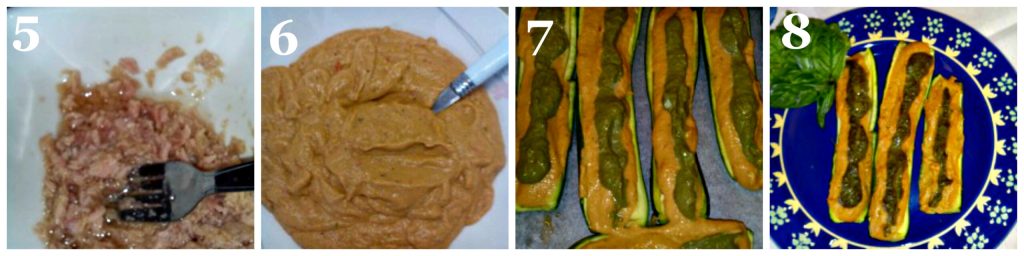 • Fill the zucchini boats with the tuna cream and the remaining pesto (6). Bake them in a moderate oven for another 20 minutes (7). Serve either warm or cold, as you prefer (8).