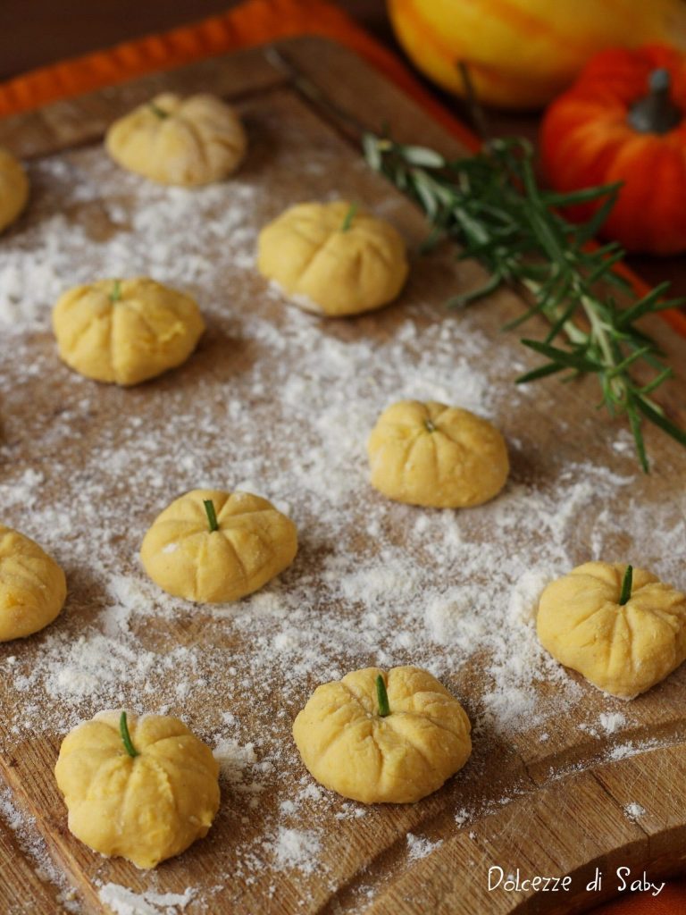 At this point, if you want, you can cut rosemary sprigs into 2-3 pieces and stick them as a pumpkin stem, which ATTENTION if it is small, can be eaten, otherwise, you will have to remove it before eating the gnocchi. You can also use pistachio crumbs to form the stem so you don’t have to remove anything.