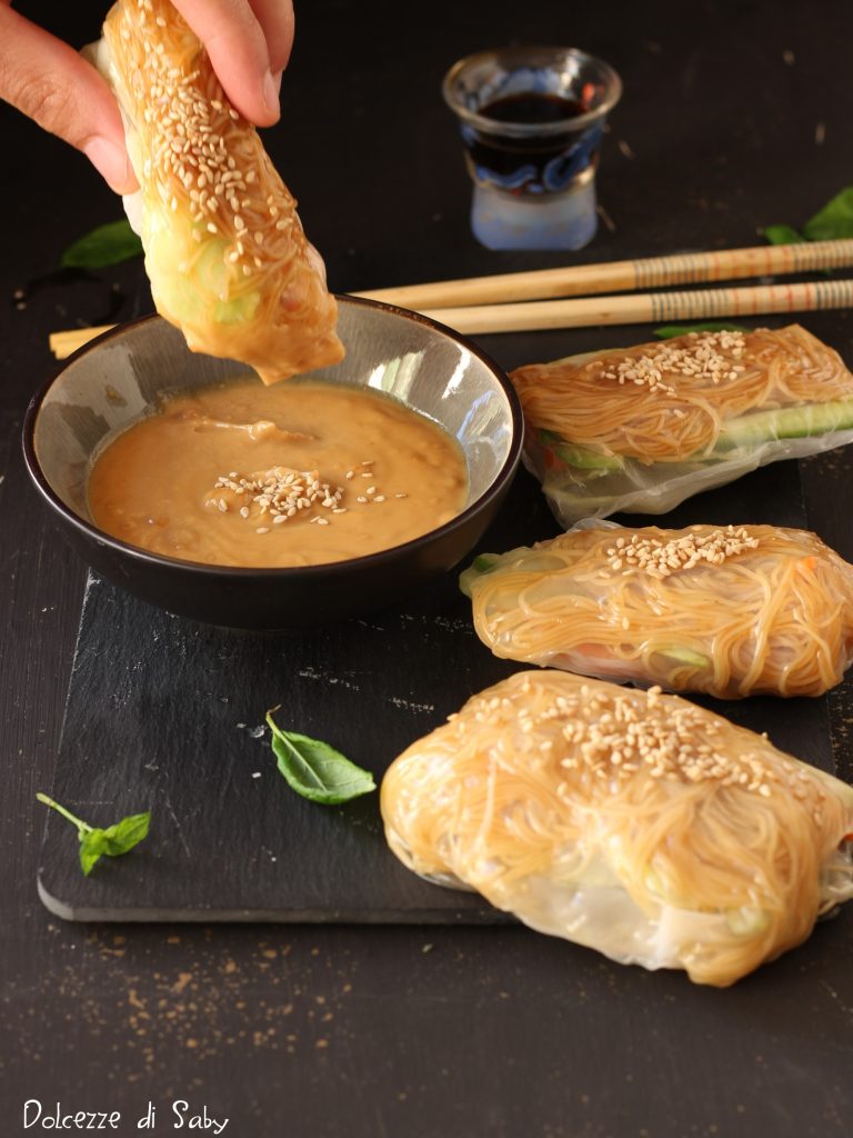 The summer rolls are delicious and very easy to make, made with rice noodles and raw vegetables or, if preferred, with meat or fish, to be seasoned and filled according to your taste. They originate from Vietnam, and unlike Chinese spring rolls, they are not cooked but wrapped in rice paper soaked in warm water and served with sauces like peanut sauce. They should be eaten at room temperature, and they are colorful and crunchy because they are filled with raw vegetables like carrots and cucumbers. My summer rolls are not quite perfect because I slightly overstuffed them and misplaced the vegetables, but since I’m sure I’ll make them again soon, as they are very good, I will also change the photo soon.