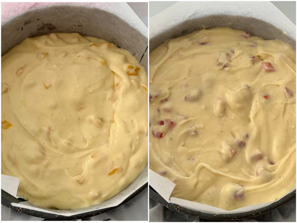 Prepare an 18/20 cm (7-8 inches) baking pan lined with parchment paper, pour in the mango mixture, level with a spoon, and cover with the strawberry mixture.