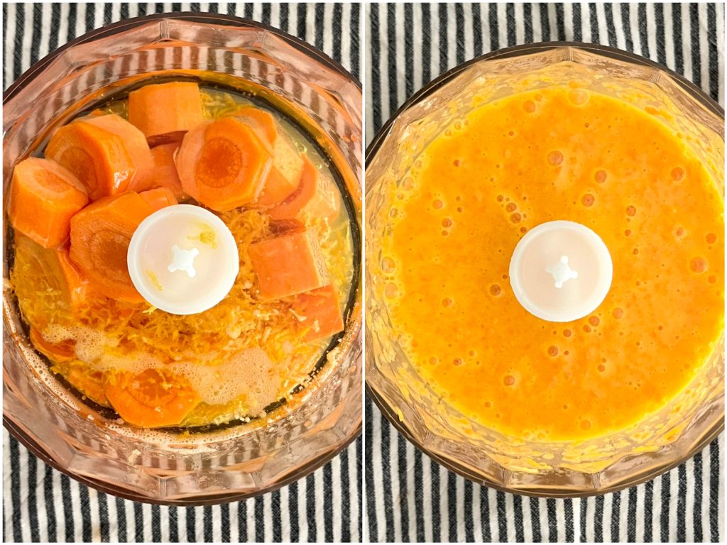Wash the orange and lemon well, and grate the zest, then squeeze the juice. Peel the carrot and cut it into chunks. Place everything in a food processor along with the oil and blend until creamy.