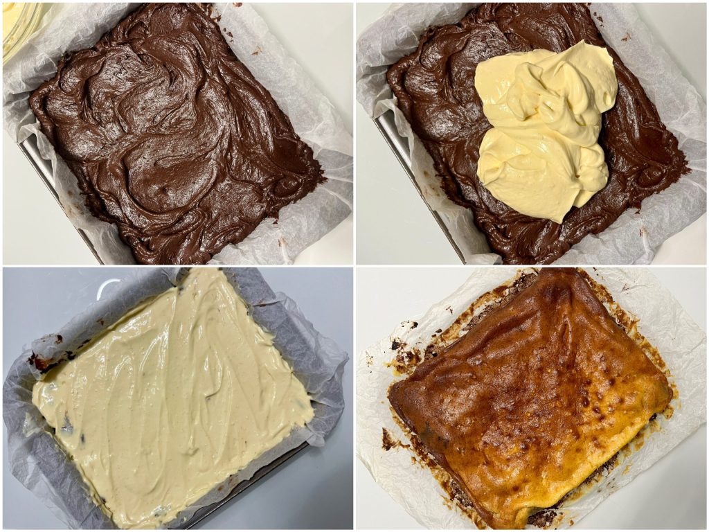 Add the melted chocolate, still beating with the mixers, and finally the flours.Pour into a rectangular baking dish lined with parchment paper and level it, mine is 8×10 inches. Set aside and prepare the cream.