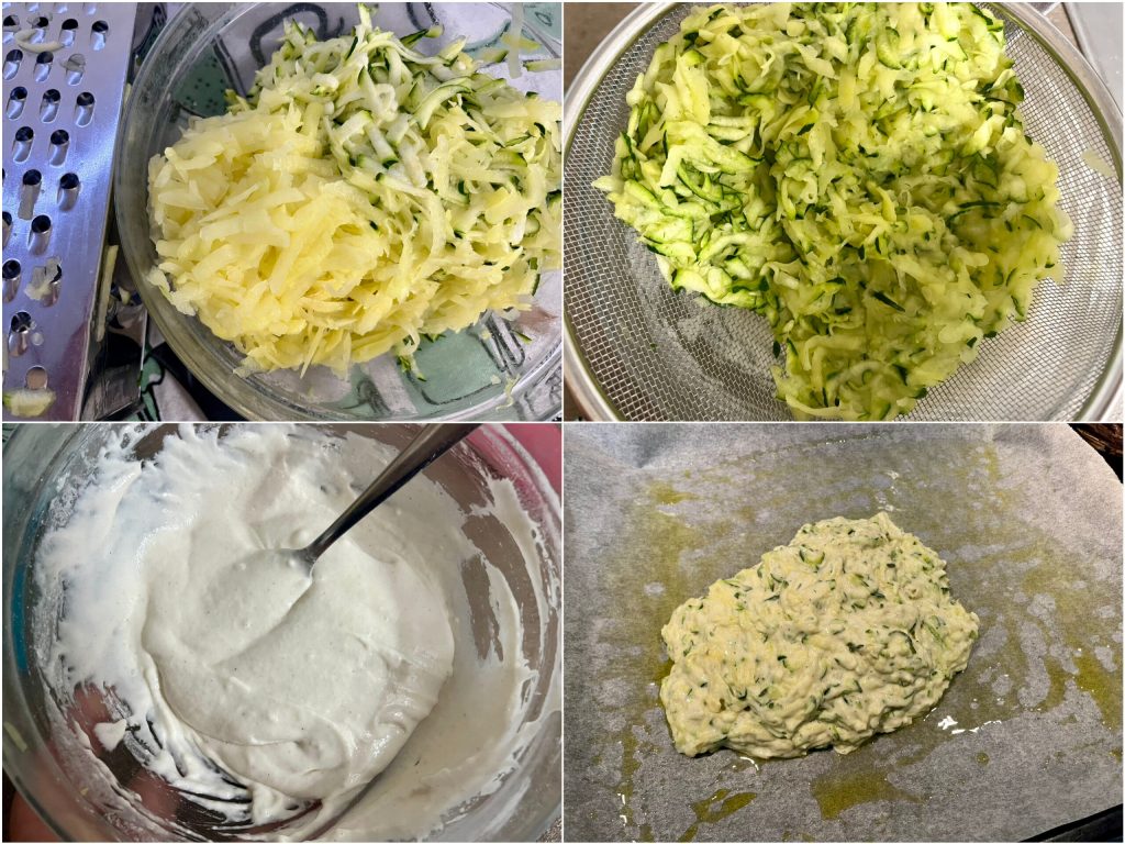 First, wash and trim the zucchini, peel the potato, and grate them with a large-hole grater. Season them with a little salt and mix them, then let them rest for about half an hour in a strainer to lose some of their water. After this time, squeeze them well with your hands.