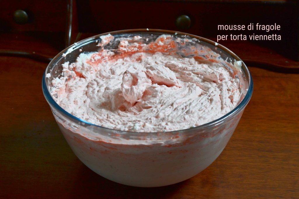 Pipe thin ribbons of mousse across the surface of the cake. Also pipe around the entire edge (no need to be perfect — this helps the strawberry slices adhere).