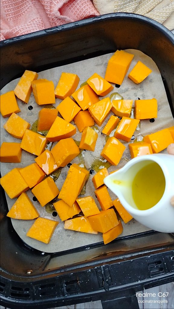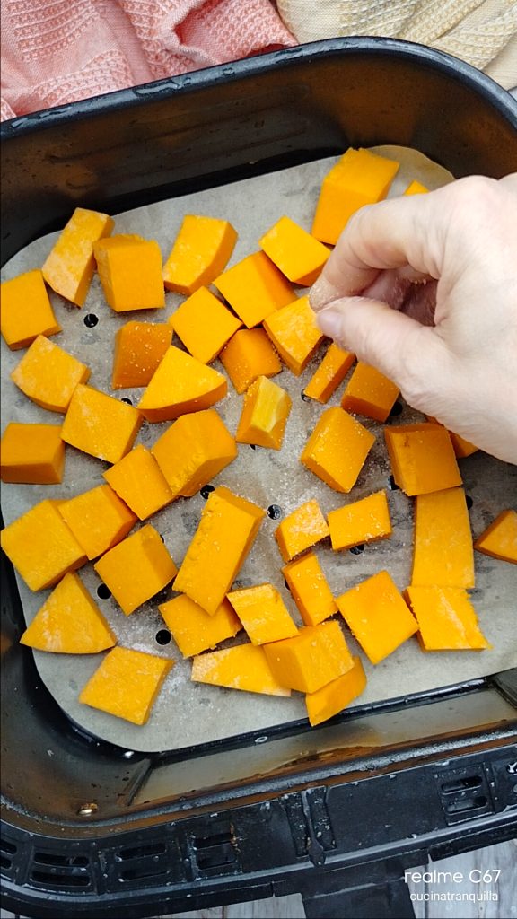 Cut them into cubes and season with a little fine salt, after placing them in the air fryer basket lined with parchment paper. If desired, you can also add some pepper to enhance the flavor.