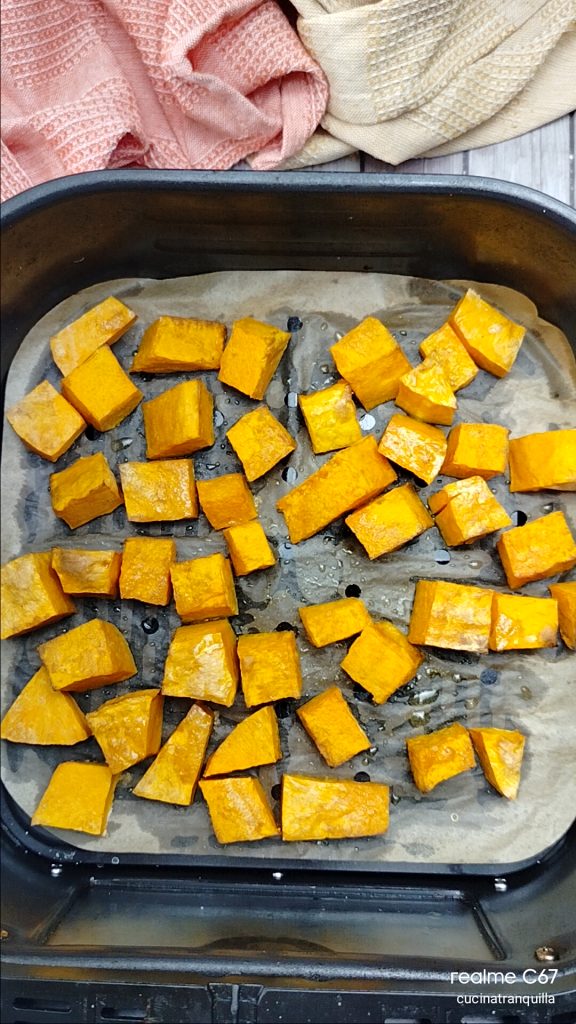 Cook in the preheated air fryer at 340°F for 7-8 minutes, turning the pumpkin halfway through cooking.