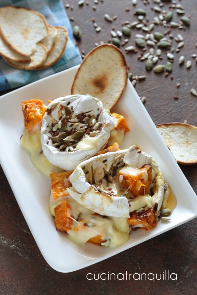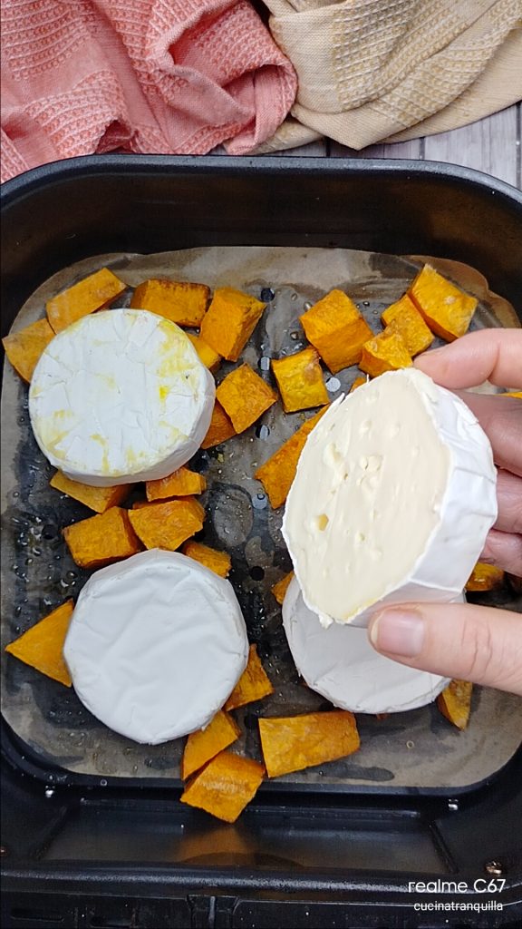 In the oven, first cook the pumpkin, after cutting it into cubes and seasoning it as in the recipe, for 15 minutes at 355°F in a preheated fan oven. Add the brie and continue cooking for at least another 10 minutes or until the brie is cooked to your liking.