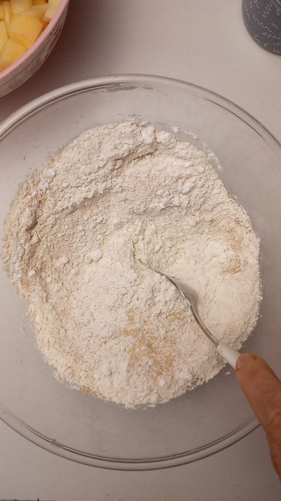 In the bowl, place the flour with the sugar, potato starch, and baking powder.