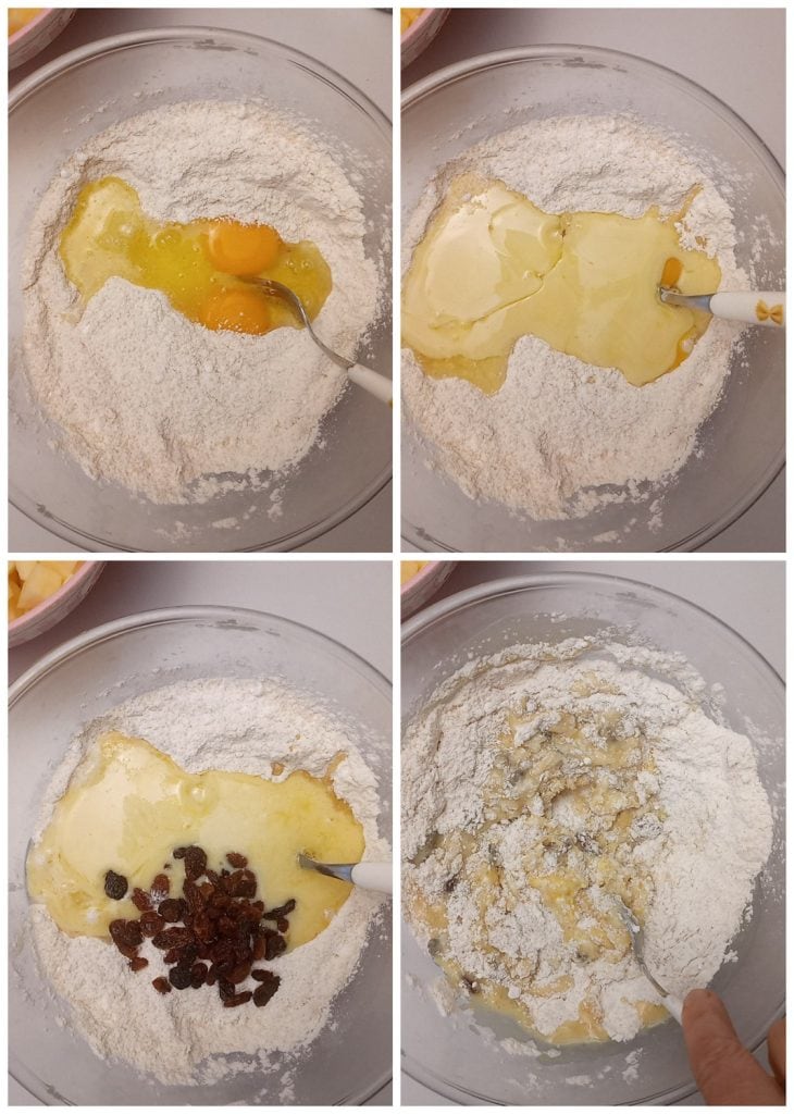 Add the eggs, milk, raisins, and butter and continue mixing.