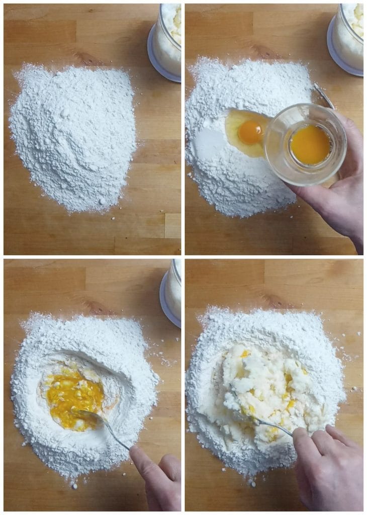 Add the whole egg and the yolk, mix for a moment with a fork and add the previously processed butter and sugar.