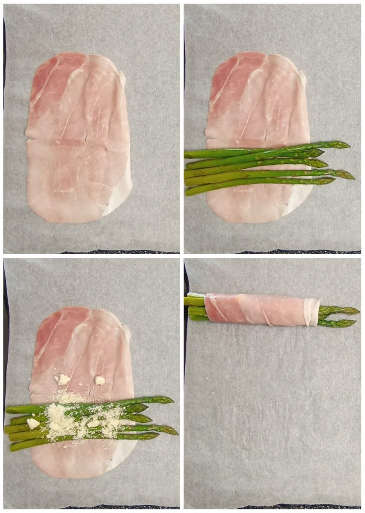 • Open a slice of cooked ham and place 5 asparagus on one side.