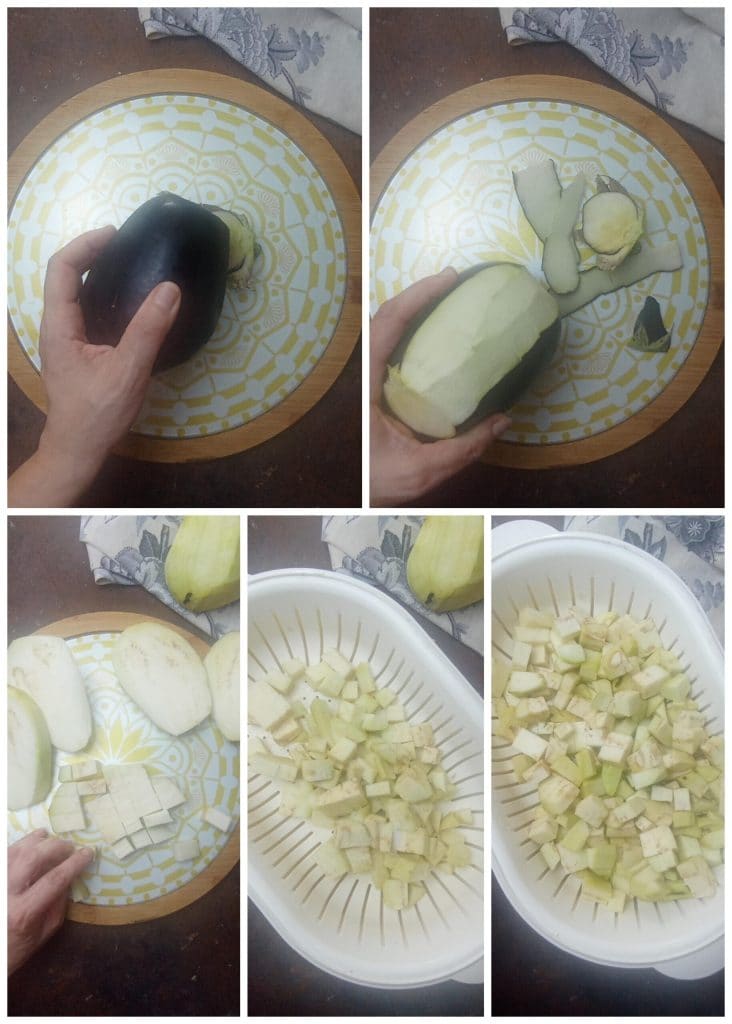 To make the oven-baked eggplant meatballs, first peel the chosen eggplants and cut them into slices and then into cubes.