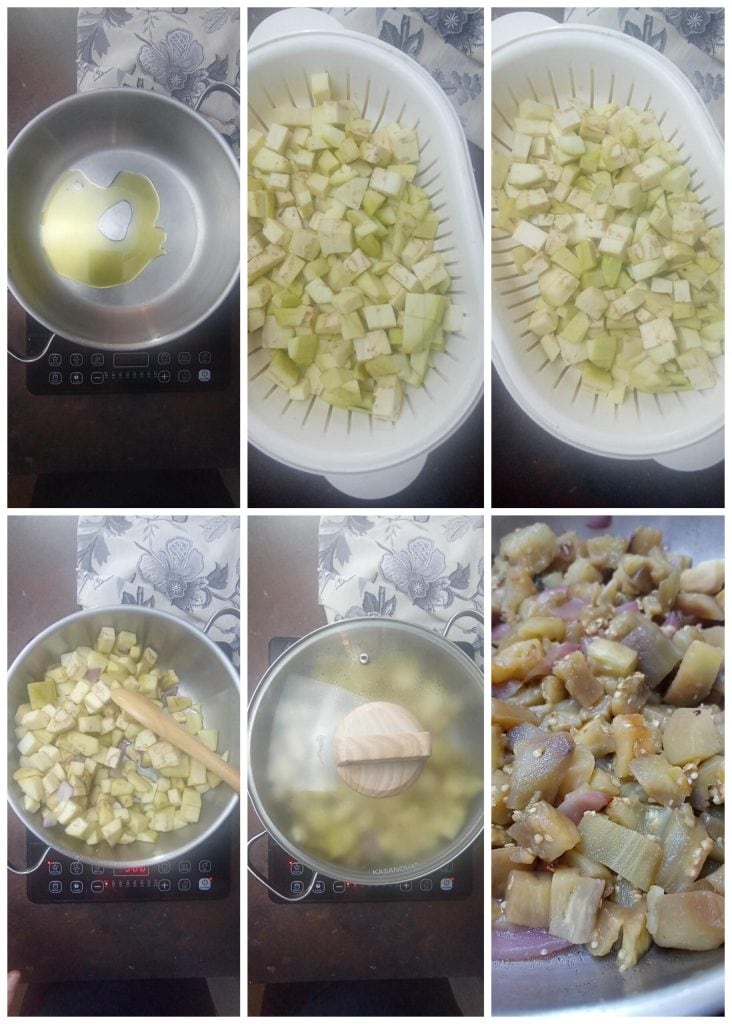 In a large pan, sauté the chopped onion in the oil for a few moments and add the eggplants.