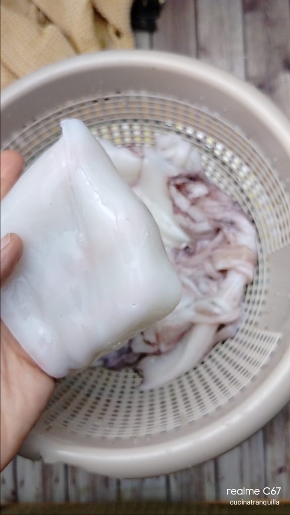 To prepare the baked stuffed cuttlefish, first clean the cuttlefish well by removing the ink sac and any filaments, cut them in half, and rinse them very well under cold running water. Dry them with a clean cloth. Separate the tentacles from the body.