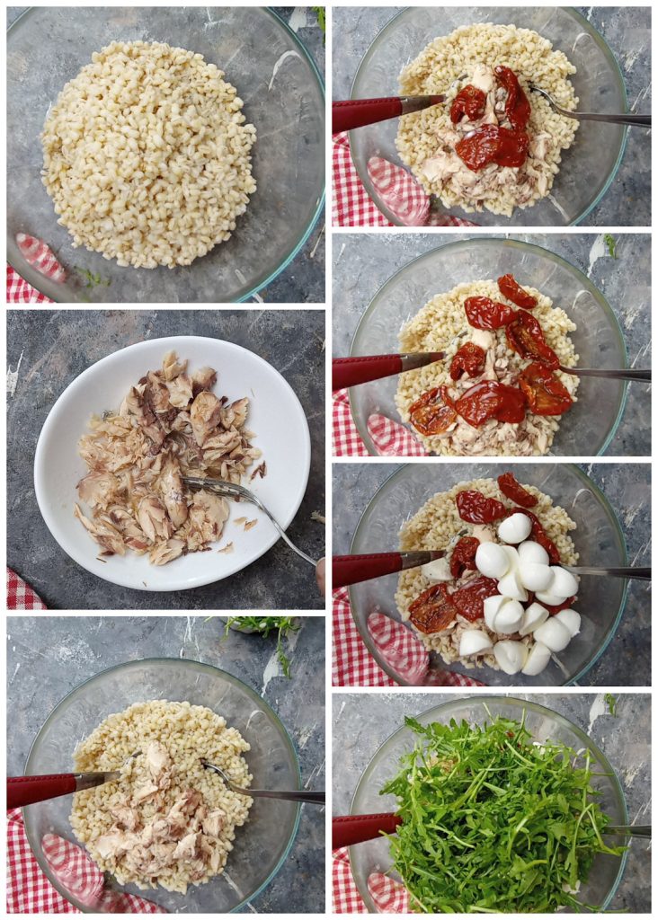 To make the Barley Salad with Mackerel and Sun-Dried Tomatoes, first cook the barley in plenty of salted water, drain it, and let it cool in a bowl with a drizzle of oil.