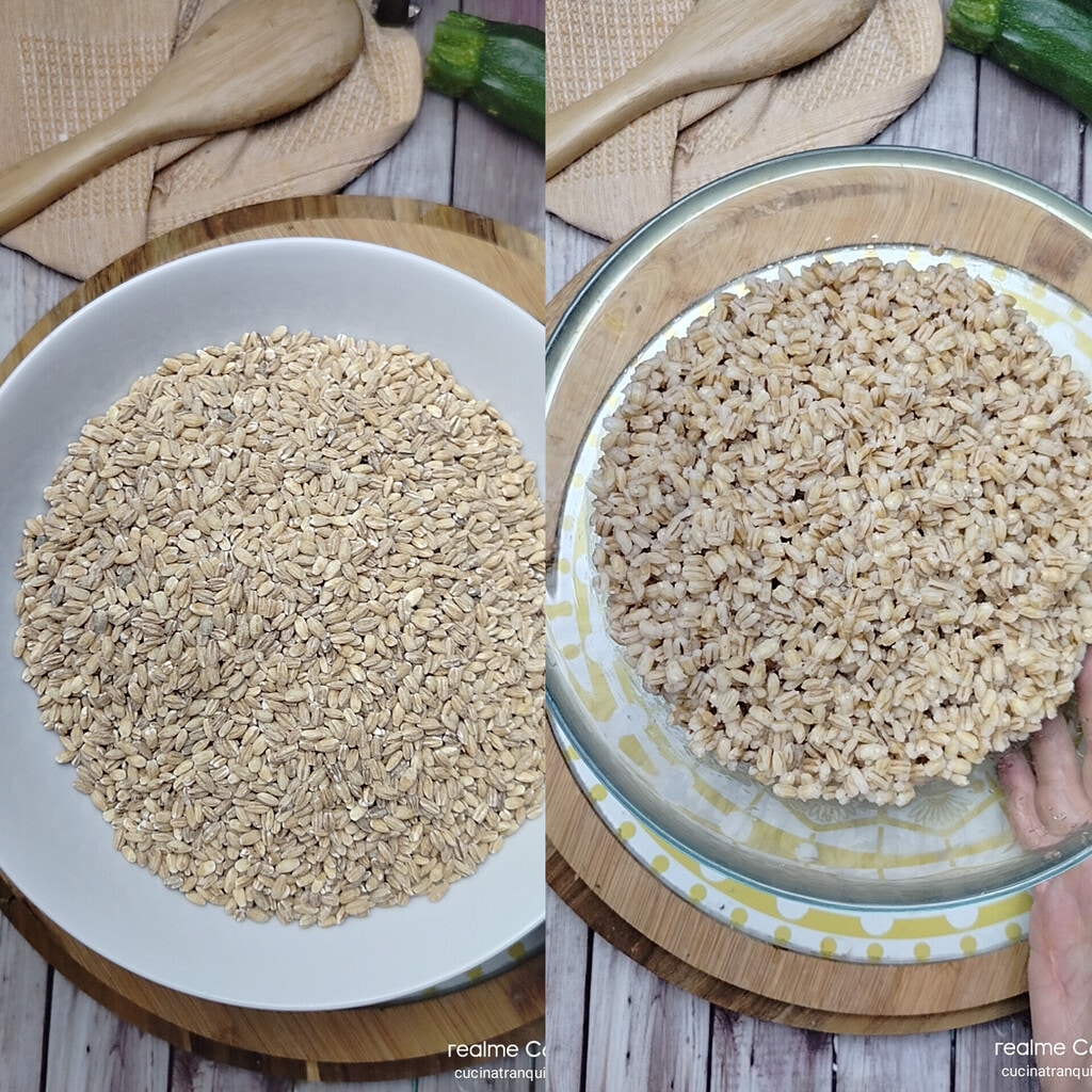 To make the Barley Salad with Turmeric Zucchini, first cook the barley in a pot with plenty of salted water following the cooking times indicated on the package you purchased. Drain and let cool in a bowl.