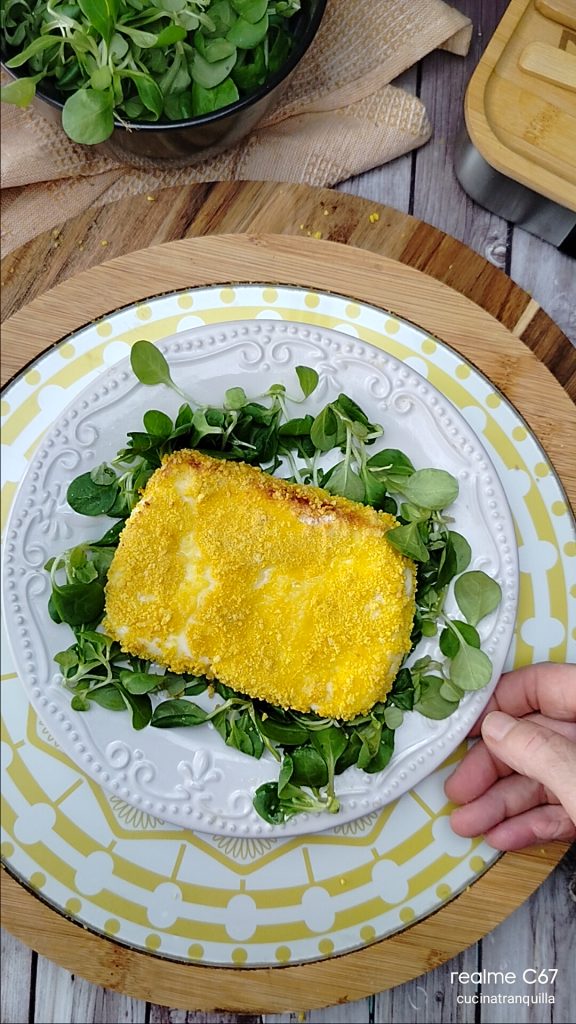 Breaded Primo Sale Cheese cooked in an air fryer, with double breading, an easy and quick recipe perfect when you have no idea what to prepare for dinner or lunch and want something super-fast to prepare in a few steps. Especially, it makes little mess and you can just add a simple lamb’s lettuce salad for a rather complete dish. For this recipe, you can use gluten-free breadcrumbs or turmeric-flavored ones, homemade or the simplest you find on the market or have at home. I like the bright yellow color it gets with this breading and also the final taste, so if you like it, feel free to follow my advice. At the end of the recipe, I leave other alternative cooking ideas, while below I share other ideas for consuming Primo Sale cheese.