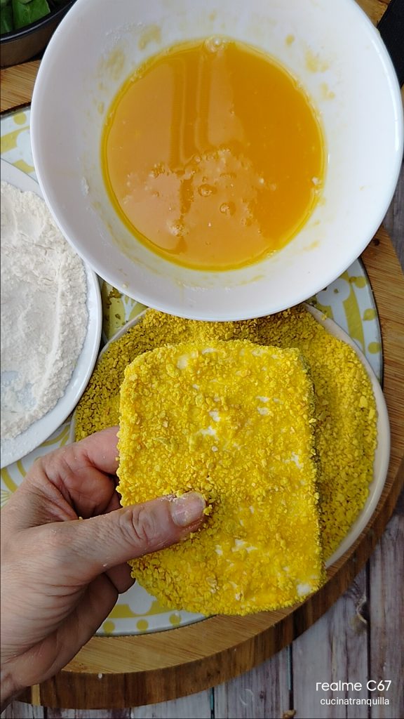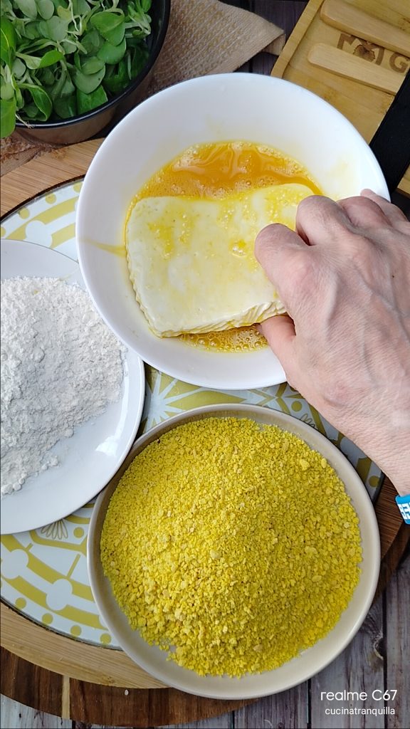Now, coat the slice in flour, pressing gently on the edges for good cheese sealing.