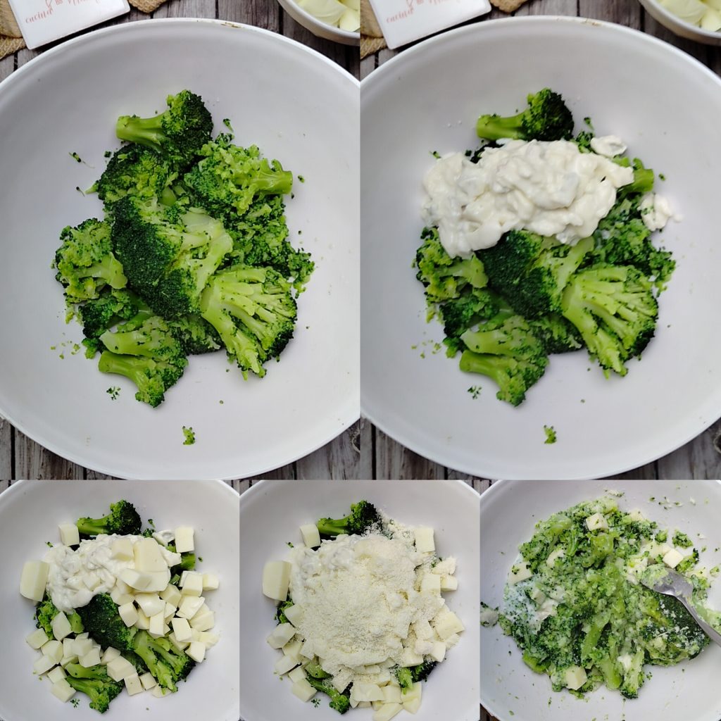 In a large bowl, add the melted gorgonzola, two tablespoons of grated cheese, and the smoked scamorza to the broccoli. Mix well.