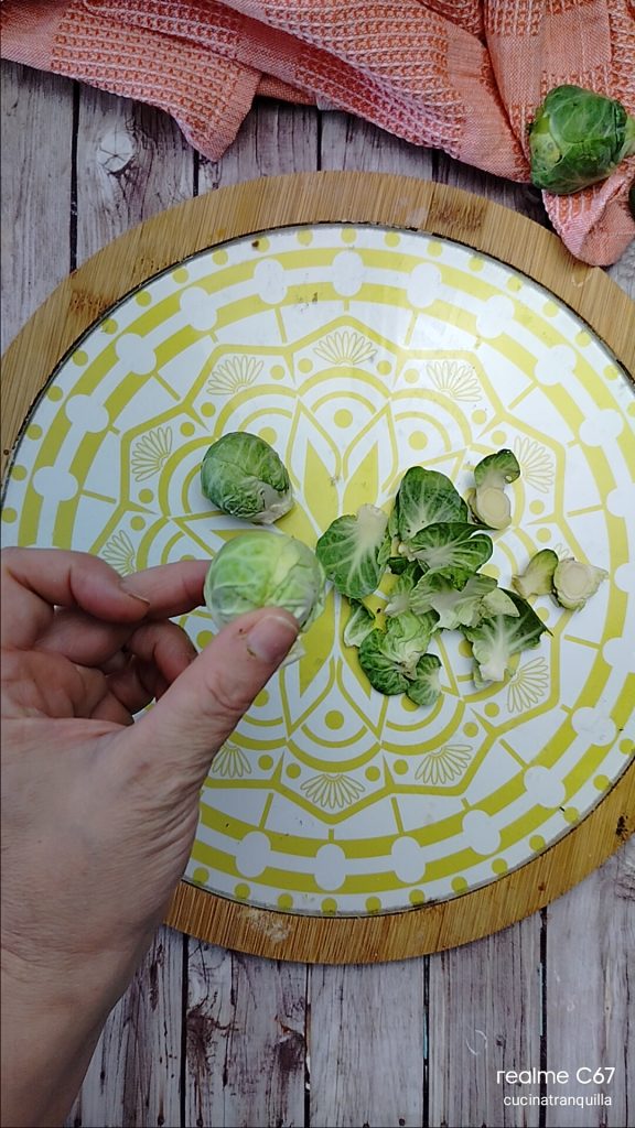 To cook Brussels Sprouts and Potatoes Au Gratin in Air Fryer, first clean the potatoes by peeling and chopping them into pieces. Clean the Brussels sprouts by removing the base and the tougher outer leaves. Blanch for 15 minutes in plenty of salted water.