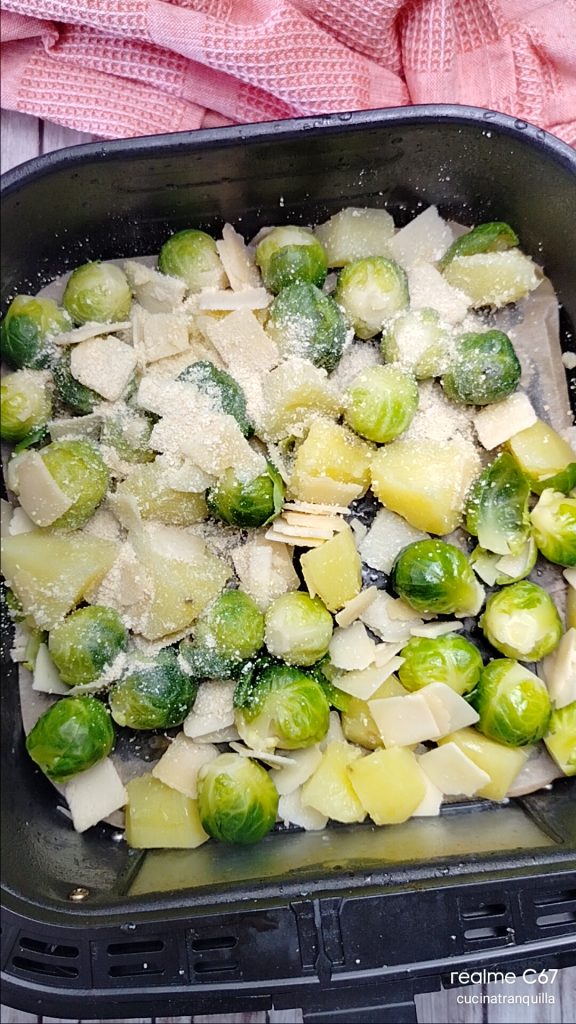 Brussels Sprouts and Potatoes Au Gratin in Air Fryer, an easy and tasty side dish perfect for accompanying all types of meat. Brussels sprouts are one of those ingredients that I think inspire little in the kitchen, and I, who love them, often try to make them in a simple and tasty, yet light way that pleases everyone in the family. This time I chose to cook them in an air fryer after a quick blanching in water. You can also choose to steam cook in this case for both ingredients, being careful not to overcook the potatoes. A quick recap on what Brussels sprouts are and then let’s move on to reading the recipe, if you wish. The Brussels sprout is an edible axillary bud of the Brassica oleracea. It has a round shape and consists of overlapping green leaves. It’s rich in nutrients, fiber, and antioxidants and has few calories. Below I leave you another idea for using this ingredient, while at the end of the recipe I answer the most common questions.