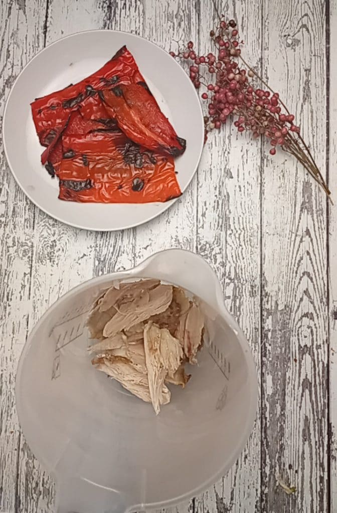 For the chicken, I used thighs from which I took only the edible parts, already cooked the day before, but for your recipe you can also choose to cook a sliced chicken breast on the grill or use another type of ready-cooked meat.