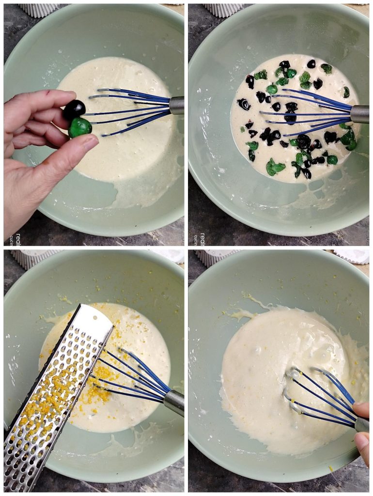 At this point, add the already chopped candied fruits, or, if you want to do like me, with green cherries and candied sour cherries cut into chunks directly in the bowl.
