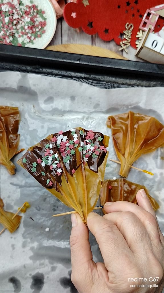 Christmas Phyllo Fans, a delightful and easy idea to make in just a few simple steps and with very little cooking. This recipe is perfect as a centerpiece or a tasty place card for Christmas celebrations. To make this recipe even more festive, I used sugar decorations with Christmas designs, but you can easily replace them with various types of sprinkles, even mixed ones. The same rule applies to chocolate: use whatever you prefer, even making cute streaks. I chose dark chocolate that I love, while for the garnish, I chose delicious and colorful sugar stars that can be found online or in well-stocked supermarkets. Below, I leave you some of my favorite sweet Christmas recipes, while at the end of the recipe, I answer some of the most common questions.