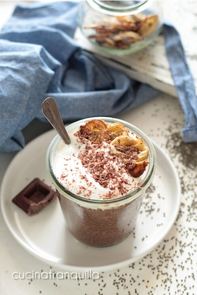 Cocoa chia pudding with banana chips, a fresh, easy, and quick recipe perfect for summer breakfasts, this time enriched with freshly grated chocolate shavings and banana chips cooked in an air fryer.
