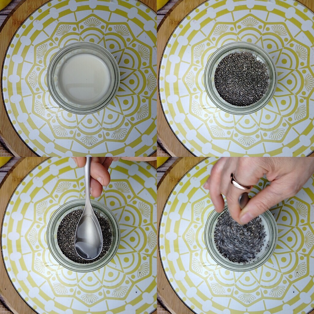 Now prepare the chia pudding by pouring the milk into the chosen cup.