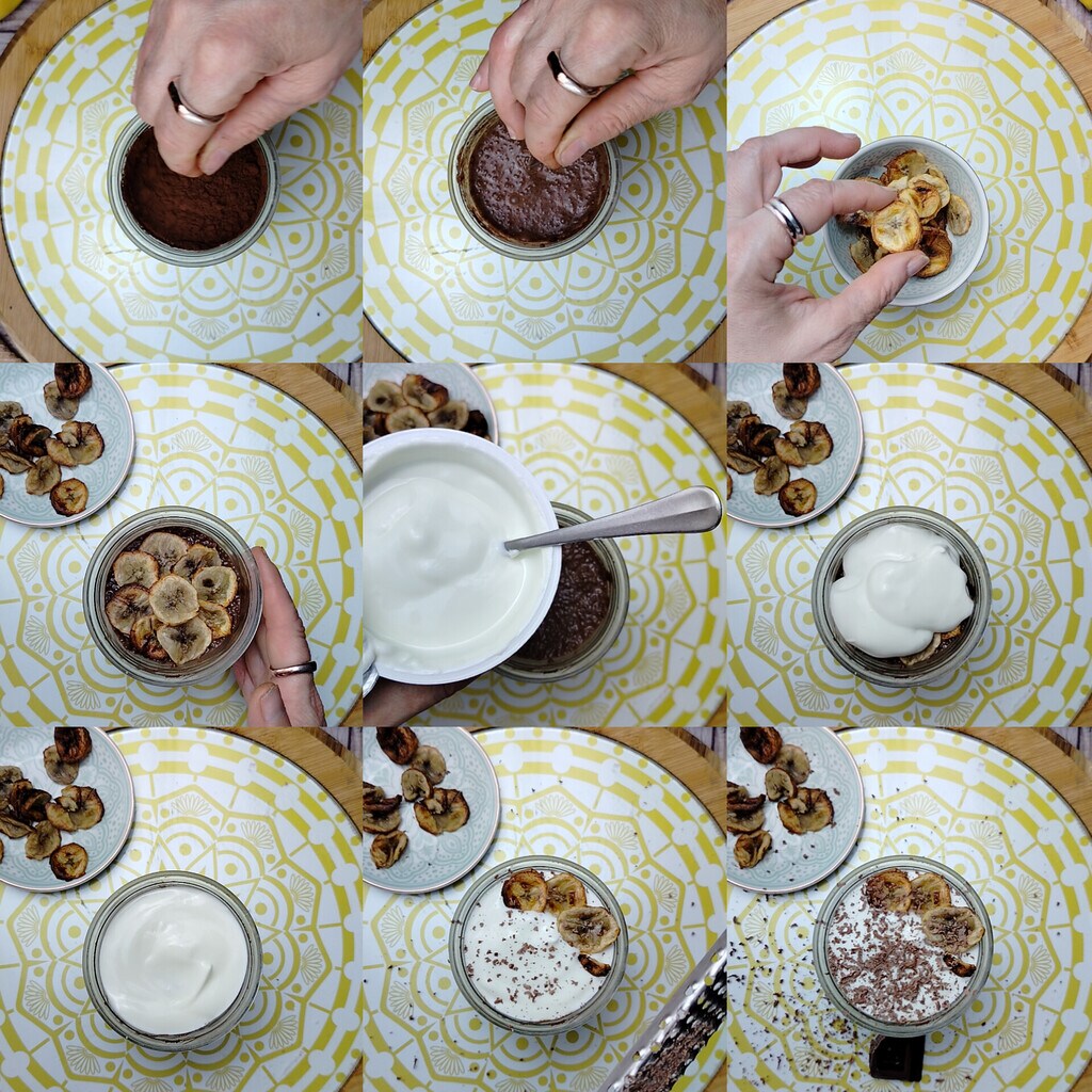 Take back the cup and place a layer of banana chips on the base of the chia pudding, garnish with creamy kefir yogurt, and finally complete with freshly grated dark chocolate shavings and some more banana chips.