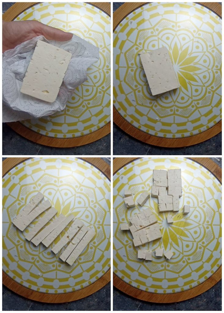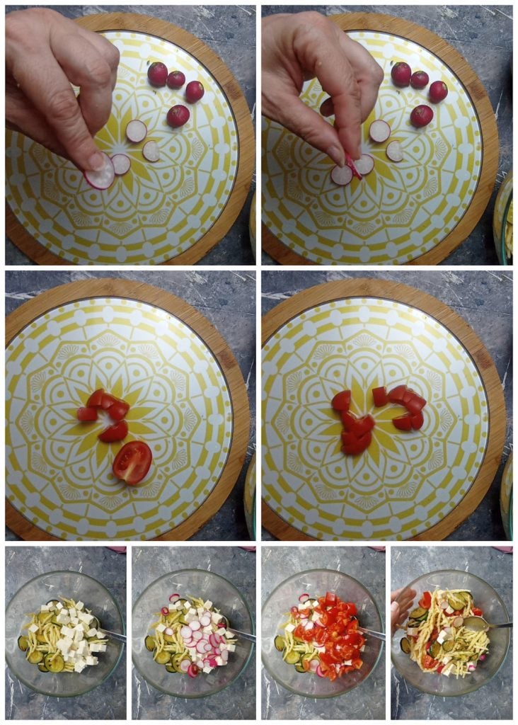 This time, I literally made this recipe with what I had in the fridge, that is, half a block of feta and a zucchini, some cherry tomatoes along with radishes for color, and off we go.