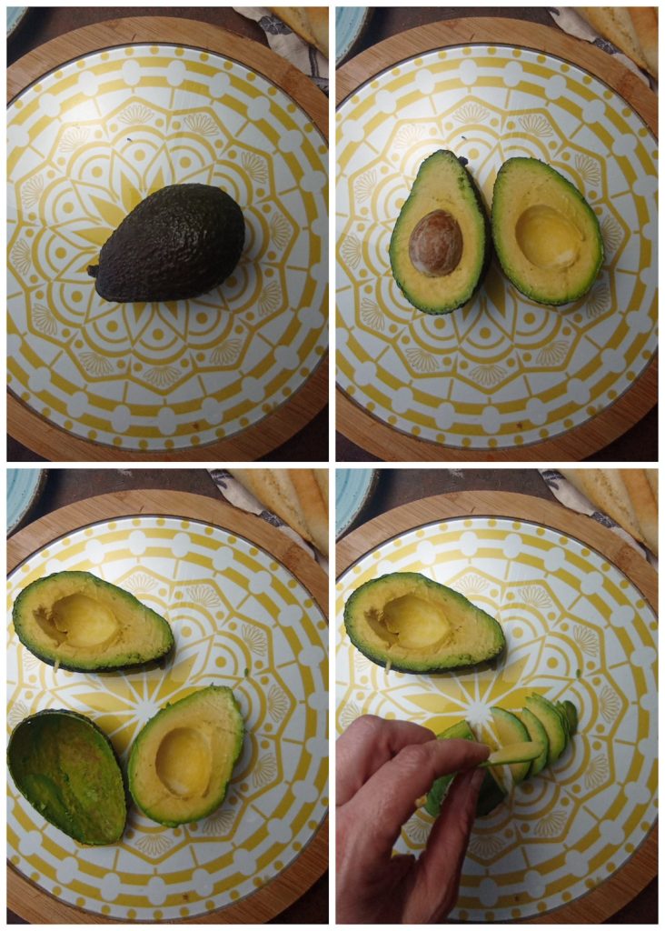 With the help of a spoon, remove the peel and cut the avocado into very thin slices.