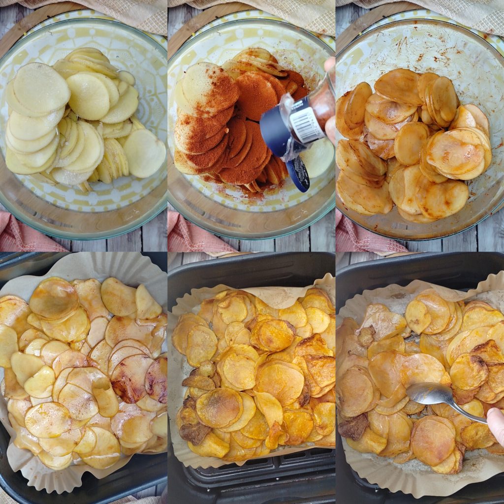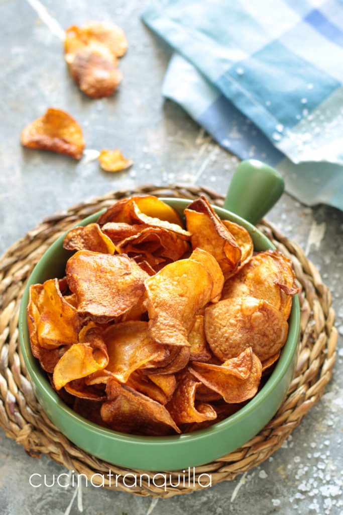 Crispy paprika potato chips in the air fryer, delicious and perfect for a gathering. They are made in just a few minutes, with only half an hour of soaking in water and salt, which helps reduce the starch in the potatoes before cooking for a fantastic result. Naturally, you’ll need a mandoline to slice the potatoes very thinly, and with this technique, you can also fry them. For a spicy result, simply add salt and paprika right after cooking. Below, I leave you some other ideas to make your potato chips, while at the end of the recipe, I answer the most frequently asked questions.