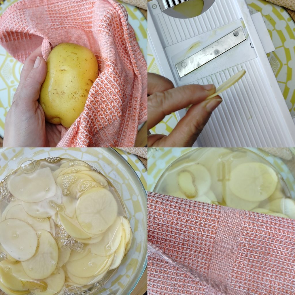 To make crispy paprika potato chips in the air fryer, first thoroughly wash the potatoes under cold running water if, like me, you intend to use them with the skin on. Alternatively, you can peel them with a peeler and wash them afterward. In both cases, dry them very well before slicing them with a mandoline. Let them rest for at least 30 minutes completely covered with the water and salt indicated in the ingredients step.