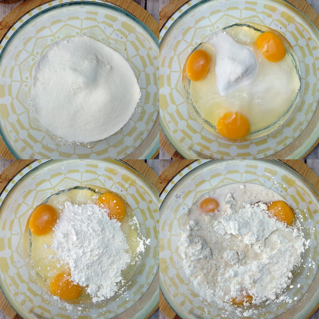 To prepare the delicious lactose-free pistachio and coconut nua cake, in a large bowl, combine sugar, eggs, all-purpose flour, rice milk, and sunflower seed oil.