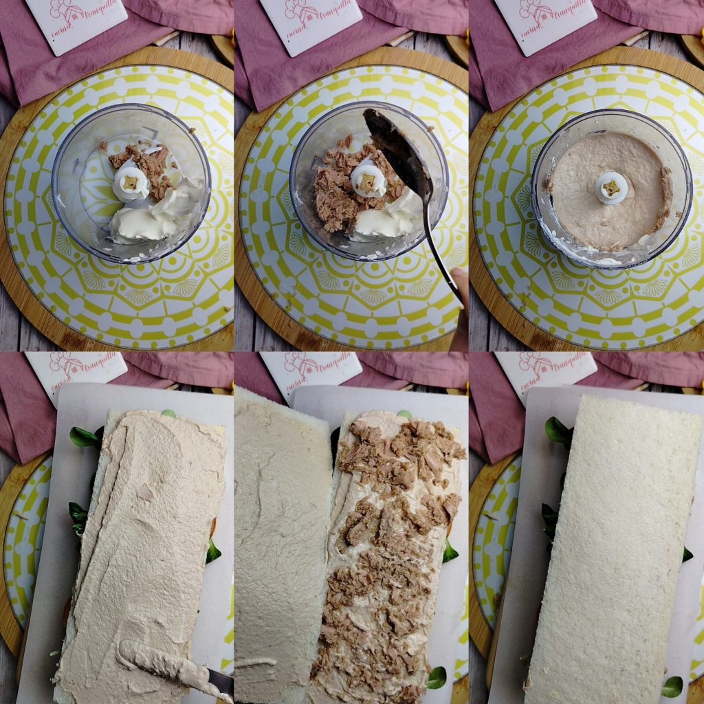 Blend about 3.5 oz (100 g) of spreadable cheese with about 1 oz (30 g) of well-drained tuna until you obtain a creamy consistency. Spread the cream on the two slices of sandwich bread intended for this layer. Complete with the remaining tuna and close with the slice of bread.