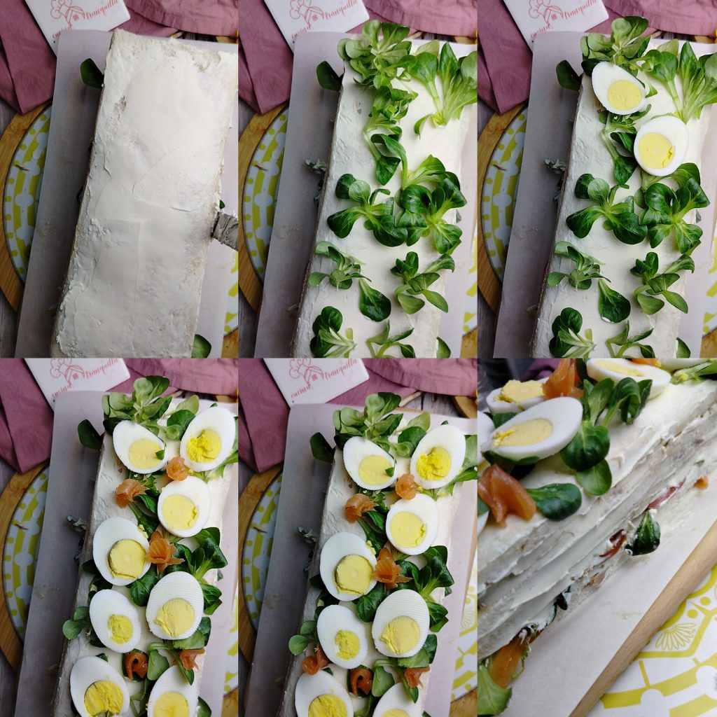 To make the Easter Sandwich Cake, first boil two eggs in a small saucepan with plenty of salted water, drain them and let them cool in cold water. Meanwhile, spread a thin layer of spreadable cheese on the first slice of sandwich bread. Arrange the smoked salmon in slices, leaving a few pieces for the final decoration. Spread another thin layer of spreadable cheese on the slice that will cover this layer and place it on top of the salmon.