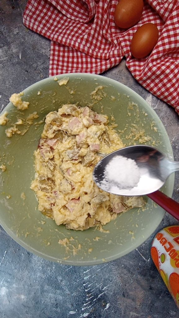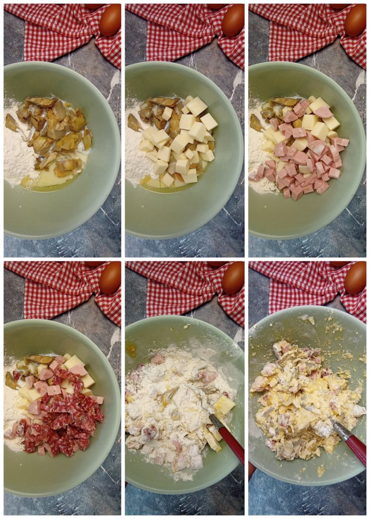 Add the blanched and cooled artichokes, the diced provolone, mortadella, salami, grated cheese, yeast, and mix.