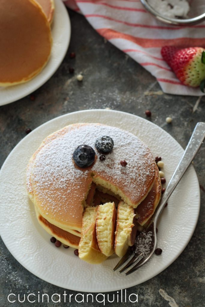Fluffy pancakes without butter, a breakfast that stays soft for days, very simple to make and very indulgent. Also perfect to make gluten-free. As we know, breakfast is one of the most important moments of the day; if it’s packed with flavor and energy even better. To help us, this time we have these delicious pancakes that contain no butter in the batter or in the cooking. But what are pancakes? They are sweet American-style fritters typical of breakfast and brunch. There are also savory versions to serve with cold cuts and cheeses. Tradition has them served stacked and topped with maple syrup and a pat of butter, but in reality we can, just like in many other recipes, let our imagination run wild. Below I leave some of my favorite ideas for presenting the pancakes, while at the end of the recipe I answer the most common questions on this topic.