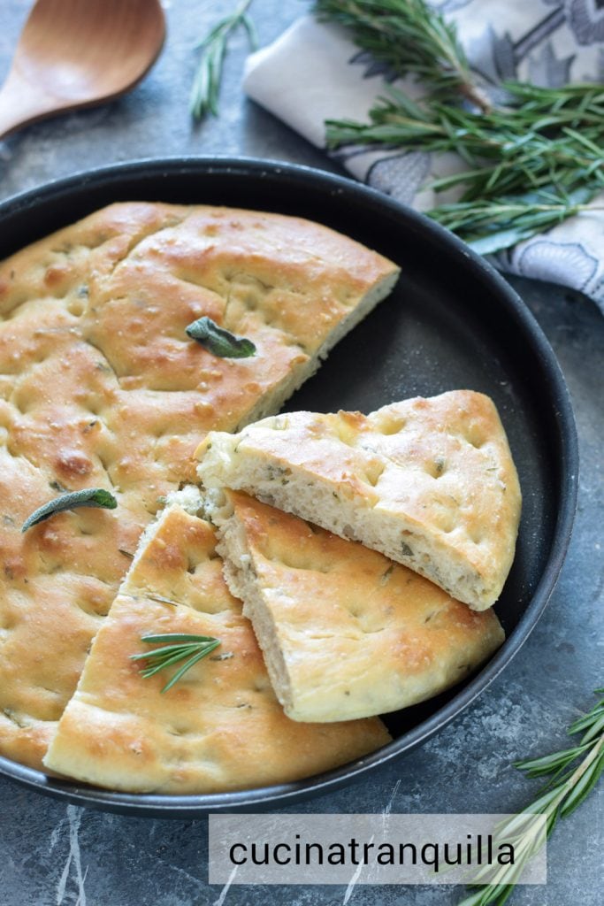 Focaccia with sage and rosemary with bowl dough, an easy and quick recipe to prepare, which still requires a short rising time.