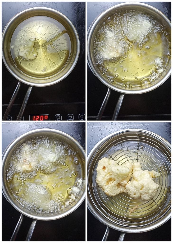 Dip a few cauliflower florets at a time after draining them well of excess batter.