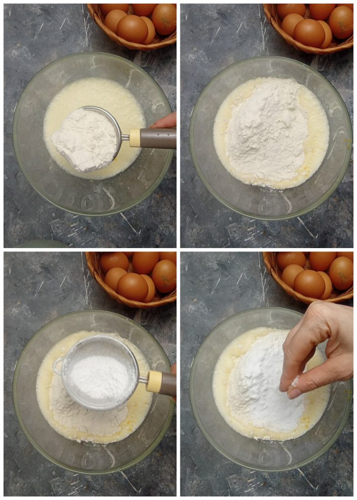 Add the sifted flour, baking powder, and a pinch of fine salt.