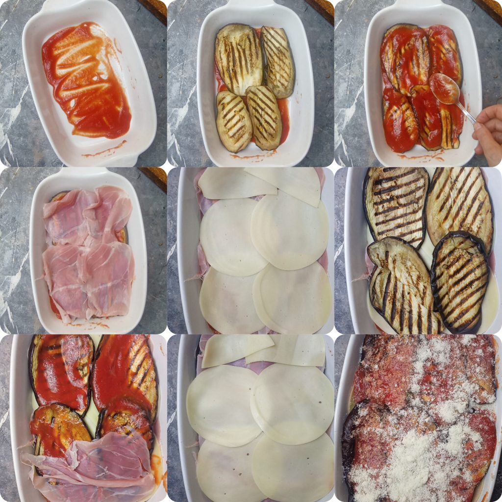 Start with the eggplants, cover them with a little sauce and add slices of cooked ham and cheese.