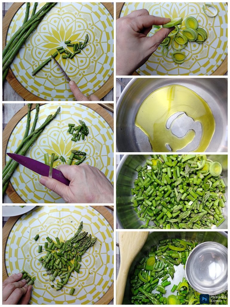 Add the asparagus and leeks together, mix and add two ladles of hot water.